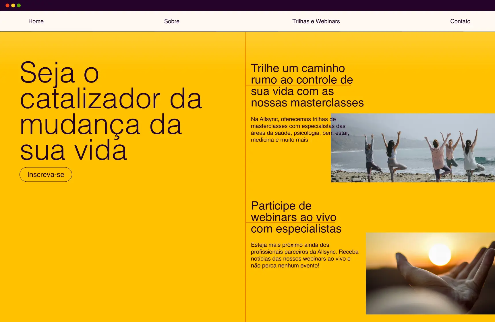 Allsync is a transformation hub. It serves as a vessel for connecting people and specialists of the body, mind and soul, in order to create selfawareness and selfknowledge to transform people's lives.